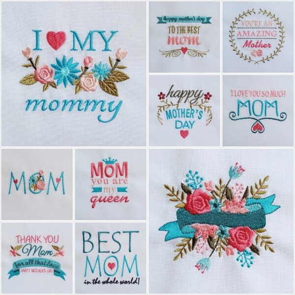 I have named it “Mother’s Day 3” but little it has in common with my older Mother’s Day sets 1 and 2. Unlike them this set includes designs digitized with cliparts by Kika Esteves. If you are familiar with my designs you know that I barely use purchased artwork for my designs but I just liked the light and modern spirit of this graphic and wanted to transform it into embroidery.