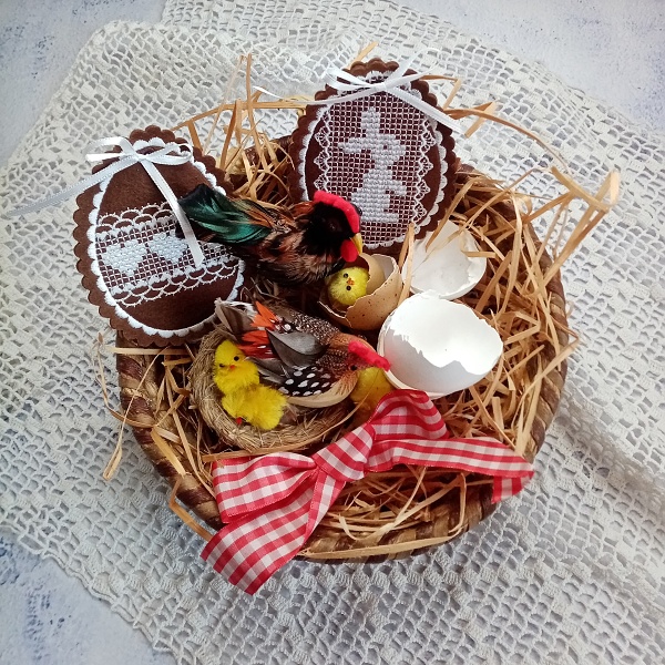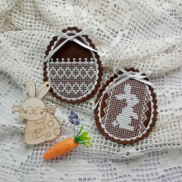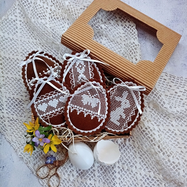 If you know my designs, you’ll probably recognize that the style of these eggs is inspired by my recent Gingerbread Hearts collection. I simply couldn’t resist — and also a few customers asked for it — so I used the same technique to create Easter decorations.