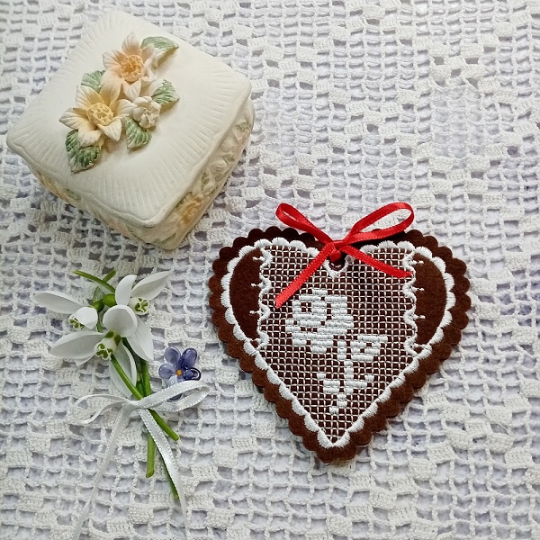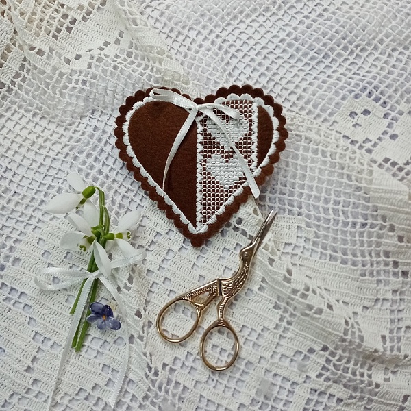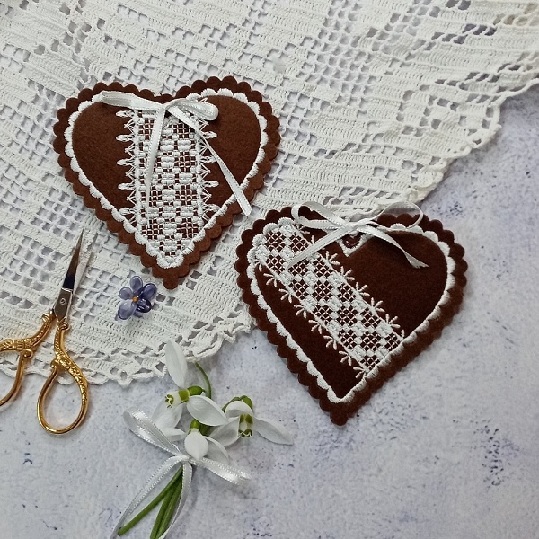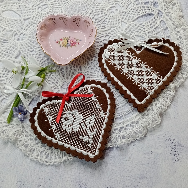 As always, my designs are carefully digitized by hand, with no automatic digitizing, and with an emphasis on minimizing jumps and color changes. The designs were created in Embird, combining the Studio module and the Cross-stitch module. The decorative motifs are stitched on the front side only; the back remains plain, with just the scalloped edge and an eye for the ribbon the stitched out. You can easily omit the eye if you don’t plan to tie a ribbon onto the your hearts.